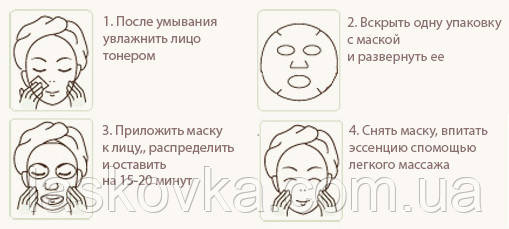 Розкрити пакет. Акуратно розгорнути маску, накласти її на обличчя і відпочити 20-30 хвилин. Ці маски дуже зручні як у використанні, так і в зберіганні. Їх легко накладати, водночас руки залишаються чистими, на відміну від нанесення маски з тюбиків. Тканинні маски не потрібно змивати, просто зняти й усе. Для досягнення максимального ефекту можна легко вбити пальчиками залишок косметичного складу в шкіру.