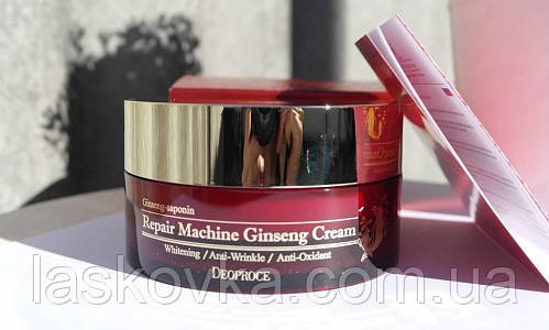Мультифункціональний антивіковий крем із женьшенем Deoproce Repair Machine Ginseng Cream надає на шкіру активну відновлювальну дію, згладжує зморшки та покращує тонус, зволожує шкіру, освітлює вікову пігментацію, освіжає тьмяний колір обличчя, надає шкірі яскравості та наповнює енергією.
