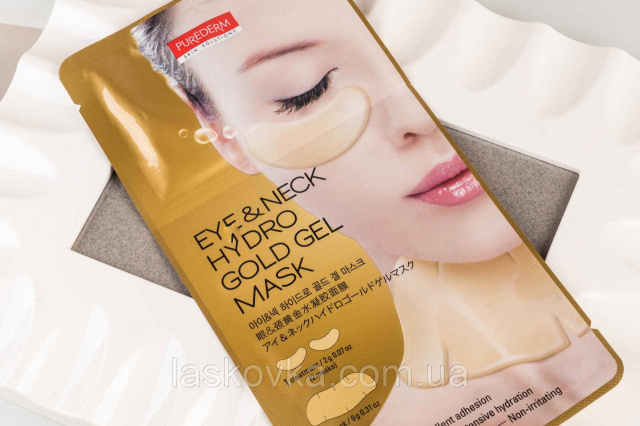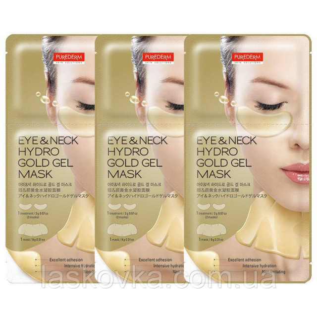 Гідрогелеві маски з колоїдним золотом для шиї (1 шт.) і зони навколо очей (2 шт.) Purederm Eye & Neck Hydro Gold Gel Mask призначені для відновлення тонкої, максимально вразливої для вікових змін шкіри.
