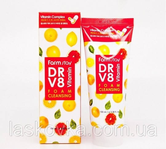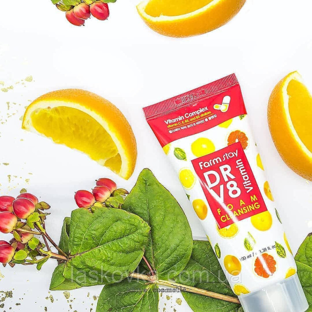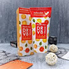 FarmStay DR-V8 Vitamin Foam Cleansing – — це повітряна пінка для вмивання для сяйва шкіри з комплексом вітамінів м'яко та ніжно очищає шкіру обличчя від будь-яких типів забруднень, не стягує й не викликає сухості та подразнення.