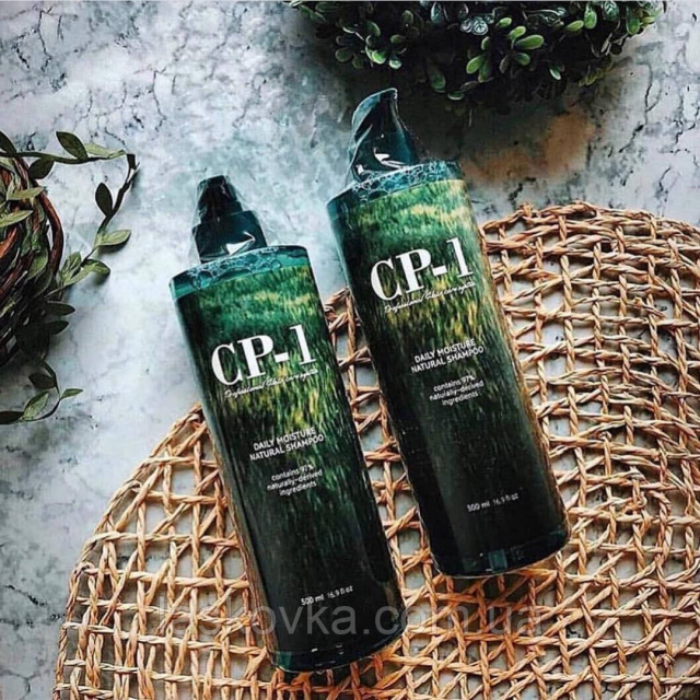Esthetic House CP-1 Daily Moisture Natural Shampoo — натуральний шампунь для щоденного застосування з протеїнами та зеленим чаєм; не містить штучних барвників, парабенів і сульфатів, не викликає алергії, частка природних компонентів — 97,6%.