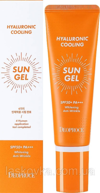 Багатофункціональний сонцезахисний гель Deoproce Hyaluronic Cooling Sun Gel SPF50+/PA+++ легко наноситься та розподіляється по шкірі та швидко вбирається, не залишаючи липкої плівки. Засіб моментально охолоджує, зволожує та заспокоює шкіру, бореться зі зморшками, освітлює та вирівнює тон. Забезпечує високий рівень захисту від ультрафіолетового випромінювання, запобігає ранньому фотостарінню шкіри, зберігає високий рівень природної вологи, надає шкірі пружності та еластичності. А також контролює себовиділення, попереджає появу запалень і висипань, звужує пори