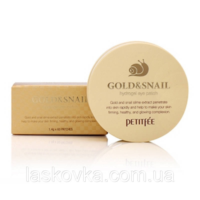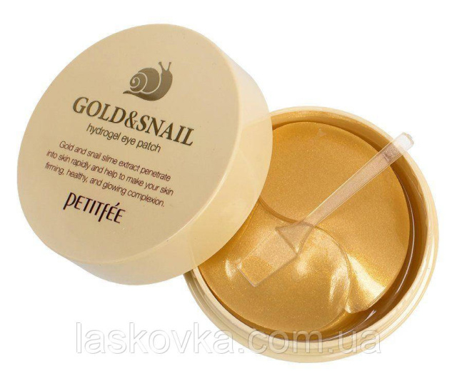 Антивікові гідрогелеві патчі проти зморщок з екстрактом равликового слизу та частинками золота Petitfee Gold&Snail Hydro Gel Eye Patch омолоджують шкіру, підтягують її та роблять пружною, згладжують зморшки, освітлюють темні кола та зменшують мішки під очима.