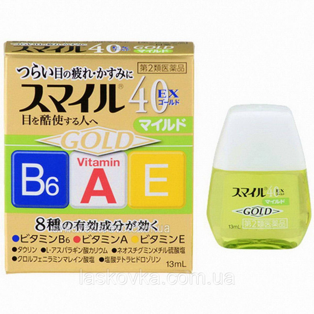 Японські краплі для очей LION Smile 40EX Gold є поліпшеною версією дуже популярних очних крапель очей LION Smile 40 EX , у яких збільшений вміст вітаміну А і доданий такий корисний для очей Таурин , який необхідний для нормального функціонування сітківки ока, захищаючи органи зору за підвищеної напруги (роботи за комп'ютерами, під впливом неприродного освітлення).