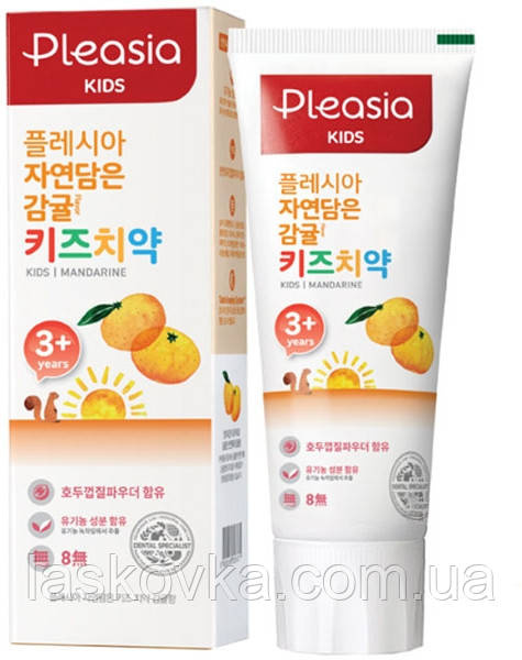 Дитяча зубна паста Pleasia Kids Toothpaste Mandarine має приємний смак соковитого мандарина, створений на основі натурального безпечного ароматизатора, водночас вона якісно очищає зубну емаль від залишків їжі та пігментованих плям після солодких напоїв, бореться з неприємним запахом із рота.
