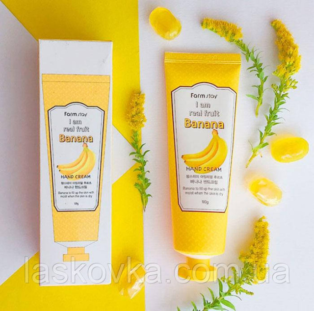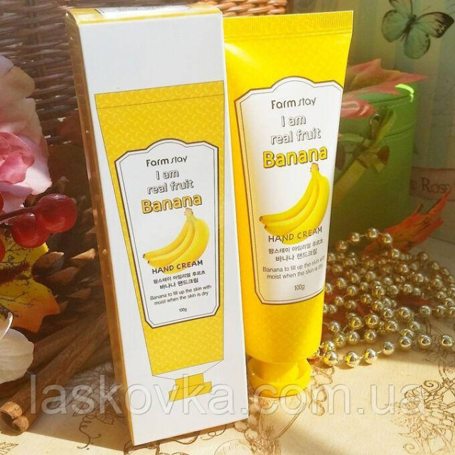 Farmstay I Am Real Fruit Banana Hand Cream тішить освіжним ароматом і вираженим зволожувальним, поживним і пом'якшувальним впливом після першого ж застосування.