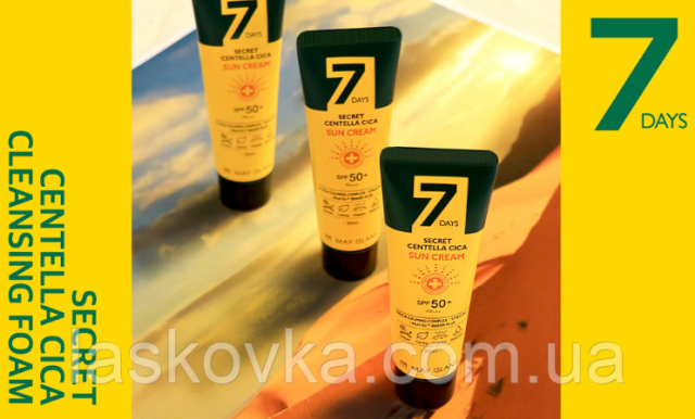 Сонцезахисний крем для обличчя з центелою May Island 7 Days Secret Centella Cica Sun Cream має ступінь захисту 50+/PA+++ зволожує та заспокоює шкіру, утворюючи невидиму оболонку, яка ефективно захищає шкіру від променів А і В.