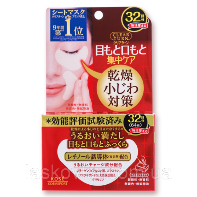 Патчі проти зморщок для шкіри навколо очей і губ із колагеном, ретинолом і гіалуроновою кислотою Kose Cosmeport Clear Turn Plumping Eye Zone Mask , 64 шт (32 пари)