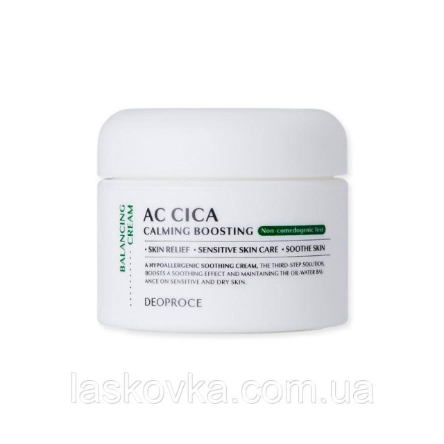 Багатофункціональний крем для обличчя Deoproce AC CICA Calming Boosting Cream спеціально розроблений для заспокоєння, зволоження і підтримання балансу чутливої, вередливої, подразненої і проблемної шкіри. Крем допомагає знизити рівень запалень, усуває почервоніння і подразнення, інтенсивно зволожує і живить шкіру, сприяє вирівнюванню тону, усуненню свербіння, дискомфортних відчуттів, набряклості. Засіб пом'якшує, розгладжує, надає шкірі гладкість, заспокоює, чинить антиоксидантну дію. А також сприяє регенерації та зміцненню захисного бар'єру.