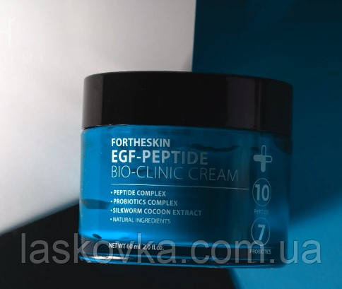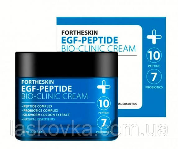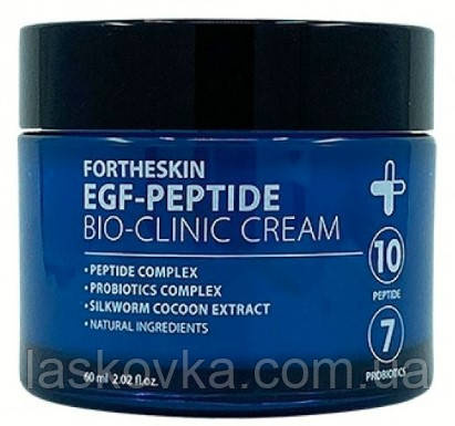 Антивіковий крем для обличчя з пептидами та пробіотиками EGF Peptide Bio Clinic Cream від південнокорейського бренду Fortheskin призначений для інтенсивного щоденного догляду за шкірою.